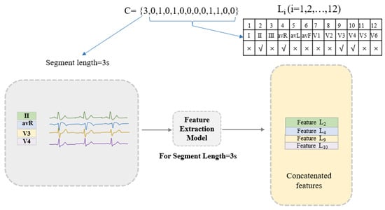 In the proposed method, the set C = [TL, L1, L2, … Li … L12] represents the combination of the time length (TL) of the heartbeat fragment and the ECG leads (Li). Among them, TL = 1,2, …, 9 indicates that the length of the heartbeat is from 1 s to 9 s. Li = 0 or 1 and, when it is 0, it means that the ECG signal of the ith lead is not used, and when it is 1, the ECG signal of the ith lead is used. It is worth noting that L1–L12 cannot be 0 at the same time, which means 0 leads are selected for classification. The combination of ECG leads and heartbeat segment length can be determined by C. Disease classification is performed using the features of the selected leads (leads with Li = 1) at the selected lengths (length = TL) extracted by the feature extraction model. As shown in Figure 3, taking C = [3,0,1,0,1,0,0,0,0,1,1,0,0] as an example, the length of the heartbeat fragment is 3 s, and the features of leads II, avR, V3, V4 are selected and concatenated for further classification.