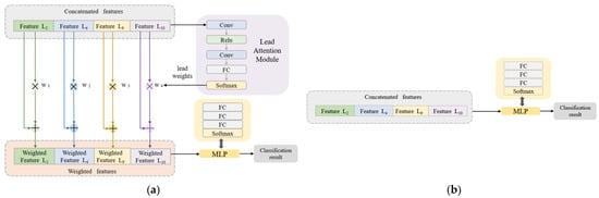 In the classification stage, the concatenated features are used as the input data of the classification network. An innovative lead attention module (LAM) is proposed. The LAM is inspired by the channel attention module [] and it is updated based on the ECG lead properties. As shown in Figure 4a (still taking C = [3,0,1,0,1,0,0,0,0,1,1,0,0] as an example), the LAM is composed of a convolutional layer, fully connected layer, and activation function. The number of FC layer nodes in the LAM is set to be the same as the number of leads (the number of leads in the example is 4, then the number of FC layer nodes is 4), so the Softmax layer will output the same number of weights as the selected number of leads. The features from each lead are multiplied by their respective weights and added to the original features to obtain the lead-weighted features. Then, a multi-layer perceptron (MLP) composed of fully connected layers and activation functions is used for the final disease classification. Compared with the pure MLP-based classification algorithm in Figure 4b, the classification algorithm combined with the LAM can effectively capture the dependencies between ECG leads and improve the classification effect of the network.