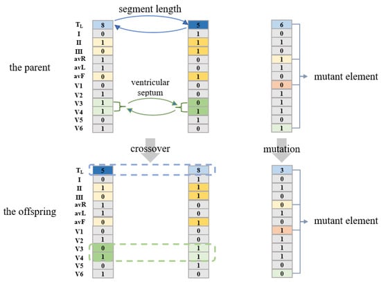 Then, the next population is generated through crossover and mutation operations. ECG leads can reflect the heart parts []. For the crossover operation, two individuals in the parent generation are randomly selected, and the crossover is carried out according to the heart parts reflected by the leads in Table 5. {[TL], [L1, L5], [L2, L3, L6], [L4], [L7, L8], [L9, L10], [L11, L12]} are crossed according to the probability of [0.8, 0.5, 0.5, 0.5, 0.5, 0.5, 0.5]. By exchanging the lead information of the 6 heart parts of the two parent individuals, the parents’ information from the 6 critical groups (shown in Table 5) can be retained. Twenty groups of crossover operations can generate forty offspring individuals. For the mutation operation, 10 individuals in the parent generation are randomly taken, and 13 elements [TL, L1, L2, … L11, L12] in each individual are mutated with probability [0.8, 0.5, 0.5, … 0.5, 0.5]. That is, for the first element TL, it changes to other fragment lengths with a probability of 0.8, and for the 2nd element to the 13th element, they mutate to the opposite value with a probability of 0.5 (0 to 1, 1 to 0). Figure 5 shows examples of crossover and mutation.