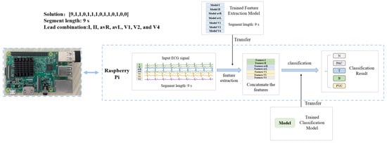 To verify the convenience of the proposed algorithm in hardware implementation, cardiac disease detection devices are fabricated using Raspberry Pi 3 Model B. The Raspberry Pi is small in size and easy to carry and can be used to simulate a portable ECG device. As shown in Figure 6 (taking the solution [9,1,1,0,1,1,1,0,1,1,0,1,0,0] for arrhythmia detection as an example), for the arrhythmia and myocardial infarction detection devices, the feature extraction model trained in Section 2.2.2 and the classification model trained in Section 2.2.3 are transferred to the Raspberry Pi. The input ECG is feature extracted and classified using the optimal solution of ECG length and lead combinations generated in Section 2.2.3.
