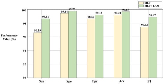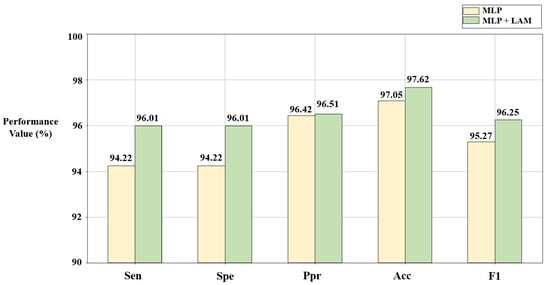 According to Figure 7 and Figure 8, compared with the pure MLP algorithm, the proposed algorithm combined with the LAM has advantages for arrhythmia detection in the SH database and MI detection in the PTB database, both of which have improvement in F1. For the electrocardiogram, not every lead carries the key information for disease detection, and there may be redundant information. The LAM can automatically generate lead weights to weight selected ECG leads, helping the model to highlight key leads, which has a positive effect on disease detection.