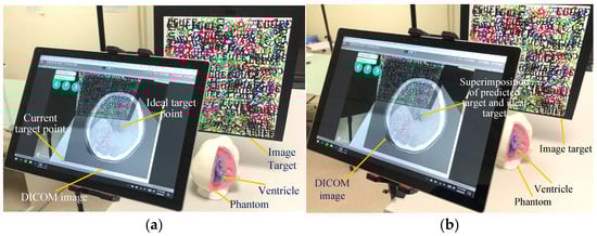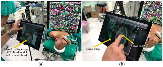 Once and have been calculated, the Unity Web Request function is utilized to present a real-time DICOM image display (Figure 2a) in combination with augmented reality. This allows surgeons to access the display without having to look away to a separate screen. Surgeons can then simply tap on the screen to select the ideal target (Figure 2b).