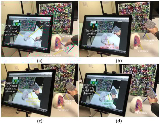 Clinical feasibility test. (a) Superimposition of the 3D model onto the patient’s head, (b) selection of target point, (c) calibration of trajectory angle, and (d) completion of calibration.
