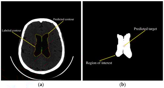 To predict the location of hydrocephalus, U-Net (the original model) was employed for deep learning to maximize accuracy and minimize loss by setting 30 epochs, and identifying all ventricular regions in the patient’s DICOM images (Figure 4b). The Labeled ventricle contour (green) and the predicted ventricle contour (red) were drawn using Matlab (MathWorks Inc., Natick, MA, USA) (Figure 4a). Finally, the average sensitivity, specificity, and accuracy for predicting the location of hydrocephalus were calculated, and these data (sensitivity, specificity, and accuracy) are the result of comparing the contour with the pixel-by-pixel method.