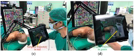 The feasibility of the proposed system was tested at various stages of clinical implementation, beginning with the conversion of DICOM images from patients into 3D models. To assess the clinical feasibility of each step, a pre-operative simulation was conducted in the operating room approximately 1 h before the surgery. Figure 5 illustrates the setup of the system in the operating room and its operation by a neurosurgeon. Specifically, Figure 5a shows the superimposed 3D model of the patient’s head position, while Figure 5b shows the DICOM-selected target position on the display. Figure 5c depicts the alignment position and angle following entry point selection, and Figure 5d shows the completed alignment. Following the entire process, an experienced surgeon concluded that the system concept is feasible for clinical use.