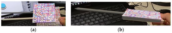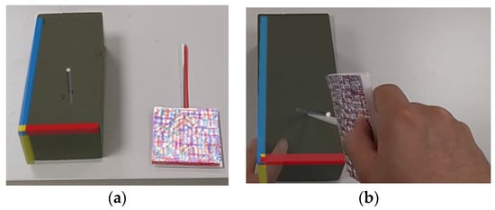 Accuracy experiment of AR overlay using HoloLens 2. (a) Superimposing the real sponge brick and the virtual model, and (b) aligning the navigation stick with the path of the virtual guide.