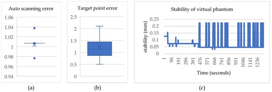 Boxplot analysis of automatic scanning and target point error. (a) Automatic scanning error, (b) target point error, and (c) line graph illustrating stability test on a virtual phantom.