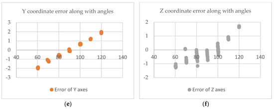 Effect of Viewing Angle Changes on Coordinate Accuracy. (a) X-coordinate error at various navigation stick angles, (b) Y-coordinate error at various navigation stick angles, (c) Z-coordinate error at various navigation stick angles, (d) X-coordinate error at various phantom angles, (e) Y-coordinate error at various phantom angles, and (f) Z-coordinate error at various phantom angles.