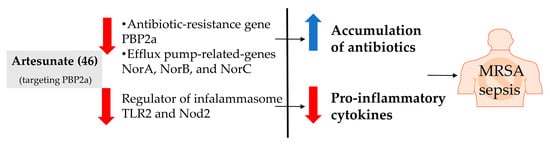 - Jiang, W.; Li, B.; Zheng, X.; Liu, X.; Pan, X.; Qing, R.; Cen, Y.; Zheng, J.; Zhou, H. Artesunate has its enhancement on antibacterial activity of β-lactams via increasing the antibiotic accumulation within methicillin-resistant Staphylococcus aureus (MRSA). J. Antibiot. 2013, 66, 339–345. [Google Scholar] [CrossRef]