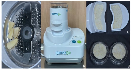 (a) Four extracted roots inside the grinding chamber after teeth cleaning; (b) dentin graft machine (Smart Dentin Grinder Genesis, Kometabio, NJ, EEUU); (c) two ground particle compartments; (d) crushed teeth in glass recipients.