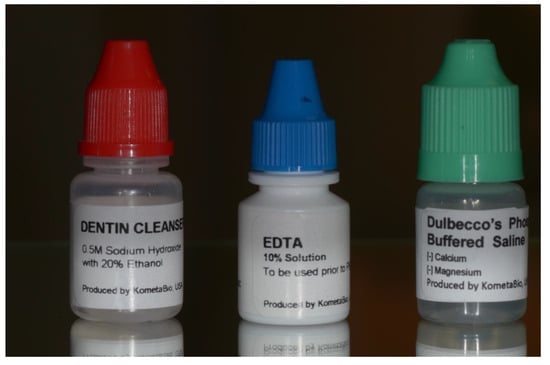 Disinfection liquid solutions: unique basic alcohol dentin cleanser (red cap), EDTA (ethylene diamine tetra acetate, blue cap), and PBS (phosphate-buffered saline, green cap).