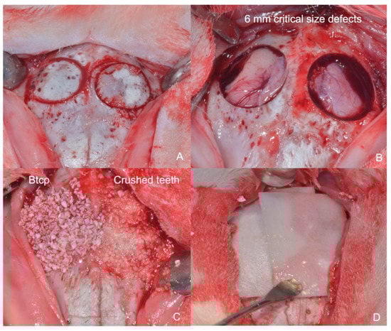 (A): Trephine critical cylindrical defects in both parietal bones; (B): 6 mm critical-size defects; (C): BTCP was placed on the right side and human sterilized crushed teeth was placed on the left side; (D): collagen membrane covering both biomaterials used in the study.