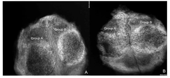 (A) Digital image of the rabbit skull showing high bone formation around the human sterilized crushed teeth graft (Group B) and less bone formation in the group at four weeks of evaluation; (B) at eight weeks, the dentin graft group showed a circular calcified area compared with Group A, which showed slight bone healing.
