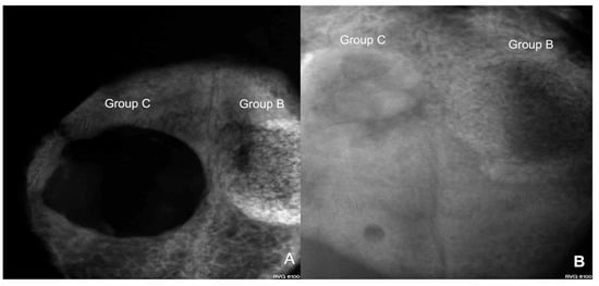 (A) Digital image of a rabbit skull showing more bone formation around the human sterilized crushed teeth graft (Group B) compared with the control group (Group C) at four weeks of evaluation; (B) at eight weeks, the dentin graft group (Group B) showed a lateral calcified area compared with slightly spontaneous bone healing in Group C.
