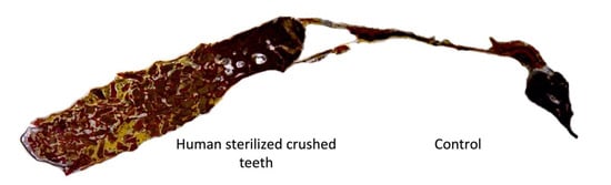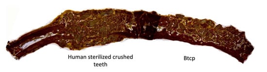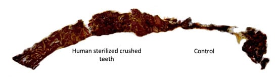 - Calvo-Guirado, J.L.; Carlos-Villafranca, F.D.; Garcés-Villalá, M.A.; García-Carrillo, N.; Jindal, V.; Martínez-Martinez, F. How much-disinfected ground tooth do we need to fill an empty alveolus after extraction? Experimental in vitro study. Indian J. Dent. Sci. 2022, 14, 171–177. [Google Scholar] [CrossRef]