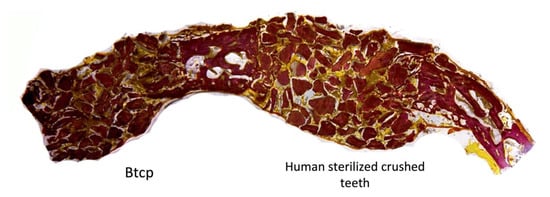 Despite the limitations of this rabbit study, we conclude that the use of human sterilized crushed teeth showed better new bone formation and allows critical-size defects to heal without interfering in the regeneration process, compared with the BTCP group and unfilled areas. Human sterilized crushed teeth is a suitable material for healing critical-size defects and also maintains a scaffold for new bone formation.