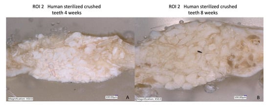 The use of the Keyence Digital microscope VHX-7000 (Keyence Corporation, Mechelen, Belgium) enabled the observation that, after four weeks, there was more prominent mild bone neoformation at R.O.I. 2 in the dentin graft concerning the biomaterial used in the study. At eight weeks, the group treated with crushed teeth (Group B) showed images of well-organized and stable new bone formation with great vascularity and cellularity where osteons can be observed, indicating complete bone regeneration (Figure 12, Figure 13 and Figure 14).