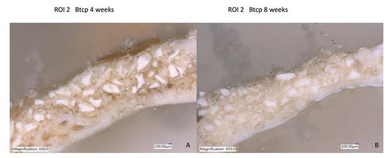 (A) Less bone formation with some particles at four weeks; (B) great resorption of BTCP at eight weeks of evaluation.