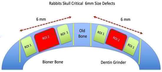 Twenty-one male New Zealand rabbits aged 31–35 weeks weighing 3.8–4.2 g were included in the study. The research study was approved by the ethics committee of the University of Murcia REGA ES300305440012, Spain, with the approval code A1320140404, which followed guidelines established by the Council Directive of the European Union (53/2013; 1 February 2013) for animal care and experimentation. The animals used in the experiment were fed a soft diet with water ad libitum throughout the study period, which was controlled by the veterinary service of the University of Murcia. Rabbit skulls are helpful in the scientific world due to similarities between the left and right parts of the parietal bones of the animal’s head. Calvaria bone is essential due to many blood vessels present in this bone, which is approximately 1 to 2 mm thick, and its cortical composition allows the assessment of new bone formation over a short period of time. New bone formation mainly occurs due to the blood supply that is present in the bone and, above all, allows the assessment of the density and quality of the obtained bone []. Furthermore, the use of the skull as a test for biomaterials is justified due to its similarity with the maxillofacial regions of the human being, stemming from their shared embryological origin, where the bones of the face developed from a membranous precursor [].