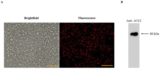 (A) Brightfield and fluorescence images of HEK293T-ACE2; anti-mouse IgGk binding protein conjugated with red fluorescent dye CruzFluor™ 594 confirmed the expression of ACE2 receptor on HEK293T cells. Scale bar denotes 100 μm; (B) Western blot of HEK293T-ACE2 using anti-ACE2 mAb and HRP-conjugated mouse IgG secondary antibody. The uncropped blot and the intensity ratio of the ACE2 Western blot band are given in Figure S3.