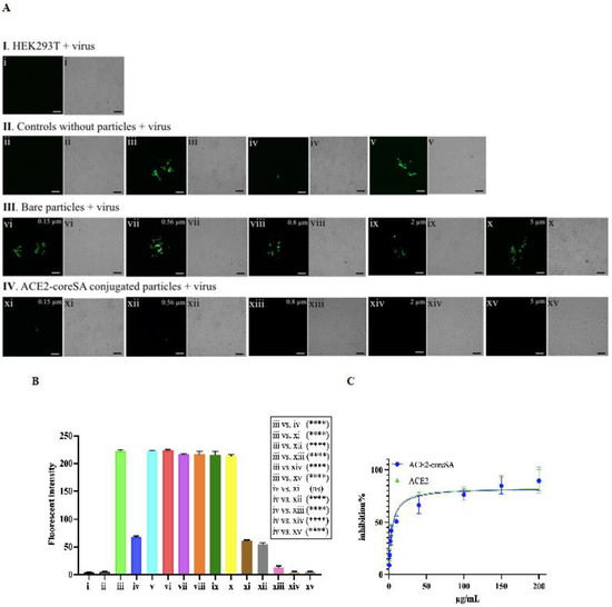 (A) Fluorescence and bright-field images of HEK293T and HEK293T-ACE2 cells. (𝐈) HEK293T cells treated with S-pseudotyped lentivirus—(i) HEK293T cells treated with virus; (𝐈𝐈) HEK293T-ACE2 cells control samples—(ii) no virus added (negative control), (iii) treated with virus (positive control), (iv) co-treated with virus and soluble ACE2-coreSA, (v) co-treated with virus and soluble coreSA protein only; (𝐈𝐈𝐈) HEK293T-ACE2 cells treated with bare polystyrene particles (non-conjugated) and virus—(vi) treated with bare 0.15-µm polystyrene particles and virus, (vii) treated with bare 0.56-µm polystyrene particles and virus, (viii) treated with bare 0.8-µm polystyrene particles and virus, (ix) treated with bare 2-µm polystyrene particles and virus, (x) treated with bare 5-µm polystyrene particles and virus; (IV) HEK293T-ACE2 cells treated with ACE2-tethered polystyrene particles and virus—(xi) treated with ACE2-functionalized 0.15-µm polystyrene particles and virus, (xii) treated with ACE2-functionalized 0.56-µm polystyrene particles and virus, (xiii) treated with ACE2-functionalized 0.8-µm polystyrene particles and virus, (xiv) treated with ACE2-functionalized 2-µm polystyrene particles and virus, (xv) treated with ACE2-functionalized 5-µm polystyrene particles and virus. Scale bar = 100 µm; (B) Relative fluorescence intensities were quantified by a microplate reader. Statistical analysis was performed using one-way ANOVA followed by Tukey post hoc multiple comparisons tests. Data were presented as mean ± standard deviation (n = 3); ns denotes not significant and (****) denotes p < 0.0001; (C) The half-maximal inhibitory concentrations of ACE2 and ACE2-coreSA required to inhibit 50% of S-pseudotyped lentivirus infection were determined using non-linear regression, respectively.