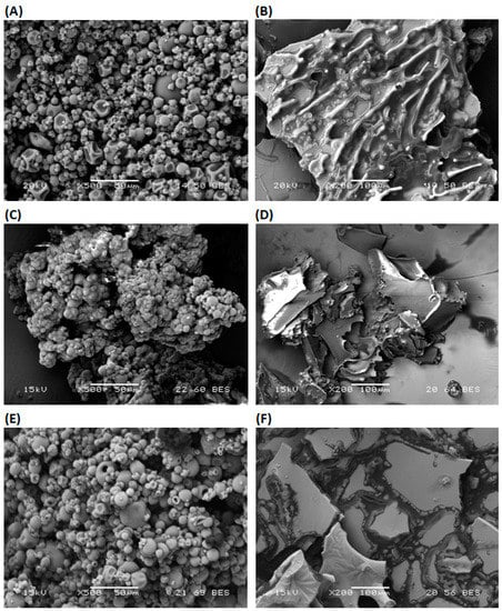 Scanning electron microscopy images of olive oil microcapsule prepared by olive oil with the different proportions of MD and WPI, and dehydration processes (SD, FD); (A) 100 WPI SD, (B) 100 WPI FD, (C) 100 MD SD, (D) 100 MD FD, (E) 50 MD−50 WPI SD and (F) 50 MD−50 WPI FD. MD: Maltodextrin, WPI: Whey protein isolate, SD: Spray-drying, FD: Freeze-drying.