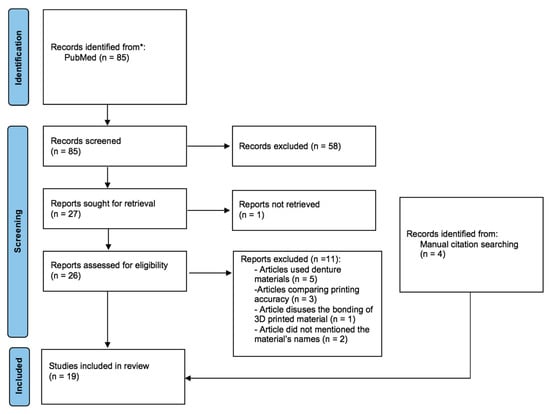 Therefore, this study aimed to undertake a systematic review of the published literature on the mechanical properties of 3D-printed provisional materials for crowns and FDP. We conducted this review to test the null hypothesis that there was no significant difference in mechanical properties between 3D-printed provisional prostheses materials and the currently available milled and conventional provisional fixed materials. The underlying patient or problem, intervention, comparison, and outcome (PICO) question was: “Within the available studies in the literature, do provisional 3D-printed fixed materials have mechanical properties comparable to conventional or milled provisional fixed materials?”. The primary outcome was the mechanical properties of 3D-printed provisional fixed materials compared to conventional and milled resin materials. The secondary outcome was the mechanical properties variation between the different 3D-printed provisional materials and conditions.