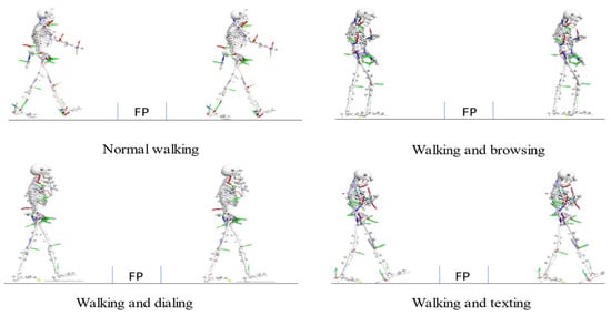 Walking while using mobile phones has become indispensable to people’s daily lives. In the “State of Mobile 2022” report, App Annie shows that people spent more time than ever before in mobile apps, reaching 4.8 h per day in the top mobile-first markets []. Several studies found that compared to other groups, the young spend more time on mobile phones [], especially college students []. An immersive virtual experiment found that college students’ attention would be distracted when crossing the road while using mobile phones, missing crucial visual information in the streets, which increases the danger []. Another study found that walking up/down a hill while using mobile phones would increase the chance of falling by 83% []. Therefore, the effect of walking while using mobile phones on gait is so essential that it deserves further study.
