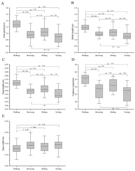 Gait speed is an essential indicator for evaluating differences in dual-task walking, which could reflect the changes in gait [,]. Furthermore, other spatial–temporal parameters (step length, stride length, cadence, etc.) were influenced by gait speed. In our study, gait speed was significantly reduced when walking while using a mobile phone, which has been widely demonstrated [,].