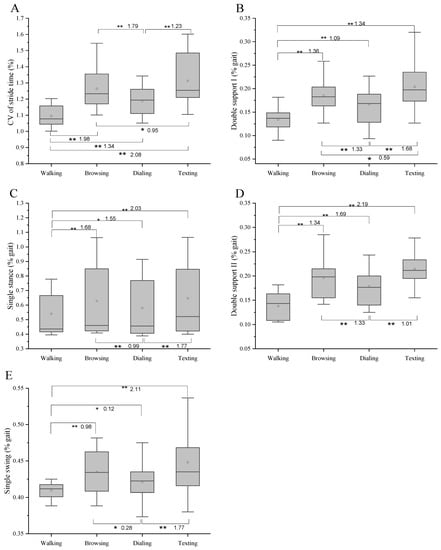 Walking while texting, dialing, and browsing the web all slowed participants’ gait speed, reducing their cadence, stride length, and step length (Figure 3). In contrast, the CV of stride time increased, and the time of single support and single stance increased significantly too (Figure 4). All the mentioned differences among walking and three dual tasks are significant (p < 0.05, p < 0.01).