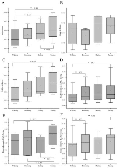 Results of one-way repeated-measures ANOVA and multiple comparisons for EMG and joint stiffness (n = 16). * Significant difference between the two tasks. (p < 0.05). ** Significant difference between the two tasks (p < 0.01). Effect size was shown after the * (**). (A) represents the hip stiffness. (B) represents the knee stiffness. (C) represents the ankle stiffness. (D) represents the iEMG of gastrocnemius during swing phase. (E) represents the RMS of biceps femoris during swing phase. (F) represents the iEMG of biceps femoris during swing phase.