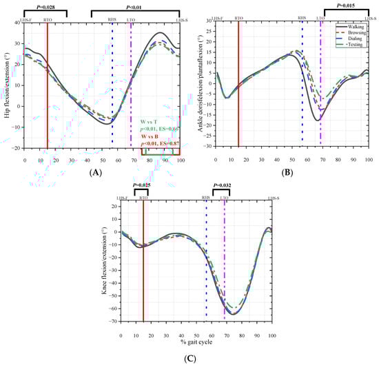 Walking while texting, dialing, and browsing significantly affects gait patterns, which increases the risk of balance perturbation and lower limb injury. Figure 6 shows the difference in kinematic parameters among the four conditions. The angle of hip flexion decreased during the first double stance phase (0–28%, p = 0.028), second double stance phase, and swing phase (44–100%, p < 0.01). Normal walk was significantly different from browsing (75–100%, p < 0.01, ES = 0.87) and texting (78–95%, p < 0.01, ES = 0.66). The angle of knee flexion decreased (9–16%, p = 0.025; 67–72%, p = 0.032) significantly, and the angle of the ankle plantar flexion decreased during the swing phase (74–100%, p = 0.015).