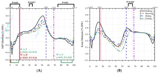 Statistical analyses were performed using SPSS (SPSS Statistics v 26, IBM Corp., Armonk, NY, USA) and MATLAB (MATLAB R2016b, The MatWorks Inc., Beltsville, MD, USA). One-way repeated-measures ANOVA implemented in the spm1d toolbox was conducted to analyze the effect of 4 different mobile phone tasks on gait, except for the spatial–temporal parameters, EMG, and joint stiffness variables as they are scalar values. For comparison of values, data distribution was analyzed for normality. An unpaired t-test tested differences between the sexes in each task and gait parameter. As there were no differences in gait parameters between the sexes, a one-way repeated-measures ANOVA with a within-subject factor of four tasks (walking, browsing, dialing, and texting) was conducted to examine the effect of mobile phone use on gait alterations. If ANOVA indicated a significant interaction, Tukey’s HSD test was used for multiple comparisons. To account for multiple comparisons, p-values were adjusted using the False Discovery Rate (FDR) method with q = 0.05 and c(V) =1. Statistical significance was assumed when p < 0.05. When significant differences were observed, Cohen’s measures of effect size (ES) were computed. For spm1d condition, those measures of effect size were computed for each time point and averaged for the duration of the significant clusters [].
