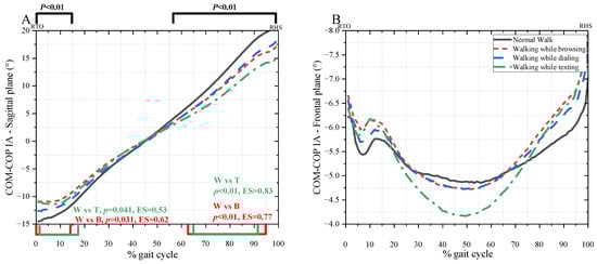 The instantaneous COM-COP IAs in the sagittal plane and frontal plane were illustrated in Figure 8. The COM-COP IA in the sagittal plane decreased with mobile phone use during the single stance phase (0–14%, 57–99%, p < 0.01) (Figure 8A). Normal walk was significantly different from browsing (0–14%, p = 0.041, ES = 0.06; 62–95%, p < 0.01, ES = 0.77) and texting (2–17%, p = 0.041, ES = 0.53; 65–92%, p < 0.01, ES = 0.83), respectively.