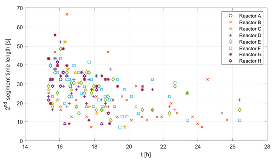 A segment length gives some information on how long a certain metabolic state lasts. Figure 6 shows the time length of the second segment for all experimental runs along the time course of the cultivations. The time length seems to be high for all runs at the beginning and lower toward the end of the cultivation. The second segment does not appear for all glucose pulses, as shown in Figure 4, and here the time becomes shorter toward the end of the cultivation. The mean of the reported values is 31 s, with a 6.5–55.5 s range for two standard deviations.