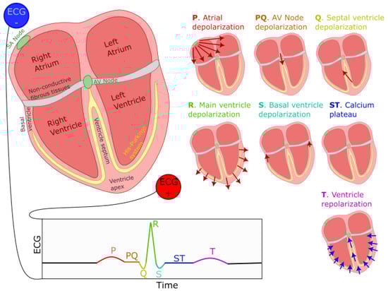 As the depolarization slowly crosses the AV node, it reaches the fast-conducting His–Purkinje network and triggers the depolarization of the lower-left section of the ventricular septum. The resulting wave travels toward the upper part of the septum, causing an equivalent depolarization dipole pointing toward the negative ECG lead and reflected as the fast and low-amplitude negative Q wave. This component is immediately followed by the main depolarization of the ventricles, causing a short-lived and large-amplitude equivalent dipole pointing toward the positive lead and visible on the ECG as the R wave. This wave then propagates to the basal region of the ventricle, generating an upward-pointing dipole identifiable as the negative S wave. Then, the repolarizing effect of potassium currents in myocardial cells becomes counteracted by the opening of calcium channels, maintaining the depolarization in these cells for a prolonged duration. This depolarization plateau is visible on the ECG as the electrical silence during the ST segment. At the end of this segment, the calcium channels close, and the outward potassium currents repolarize the myocardial cells. This repolarization starts with the cells on the outer layer of the ventricular tissues. It propagates inward and generates a negative equivalent dipole pointing toward the negative lead. This last dipole is responsible for the T component of the ECG. This sequence of events is depicted in Figure 1.