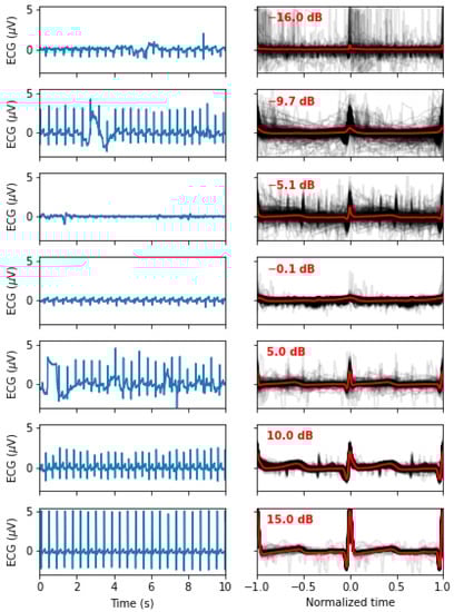 Signal quality as a function of the , as defined in (3). The left panels show 10 s of the original signals, whereas the right panels show all the normalized beats (in light grey) and the mean beat (red). From top to bottom, we display examples of recordings with an closest to −15, −10, −5, 0, 5, 10, and 15 dB.