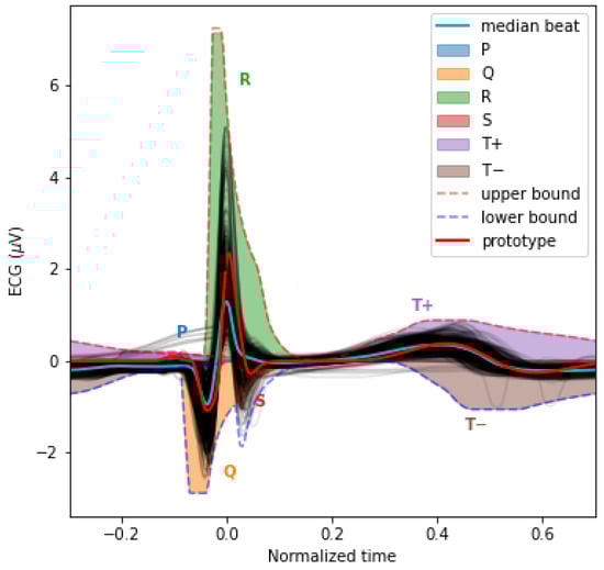 To help constrain our prototype, we used upper and lower bounds for the PQRST complexes. We defined these bounds analytically using box constraints on the lognormal parameters (4)–(7) (see [13] for the derivation of these bounds; notation further explained below). Figure 3 illustrates the envelope of all PQRST complexes generated by this sigma-lognormal (i.e., sum of lognormals) model, given the bounds we selected (see Table 1). We chose these bounds as a trade-off between encompassing the mean PQRST complexes of all recordings (except some apparent outliers) while constraining the possible solutions to minimize the proportion of the parameter space that can produce PQRST time series that are not physiologically plausible. We derived these bounds from the parameters (we use the index to refer to the prototype) of the prototype such that , except for (1) the value of the parameters being ceiled or floored to 0 when their interval intersects at 0, and (2) for . The first exception ensures that the qualitative interpretation of the different waves remains intact. A sign inversion for a D parameter may mean changing a depolarization wave into a repolarization wave, or vice versa. Such a conversion is not possible in normal physiological conditions. For example, the P wave can only be due to the depolarization of the myocardial cells of the atrium. We will never observe a hyperpolarizing wave, rather than depolarizing wave, caused by an inversion of this process. Alternatively, such polarity reversal could be due to technical issues, such as a misplacement of the electrodes. However, these acquisition problems should be managed when preprocessing the recordings rather than being captured by the model parameters. We used the second exception for a pragmatic reason; we needed to allow the parameter to vary within a wider range to include most of the recorded PQRST complexes within the established bounds. Concerning the term, the notation denotes the absolute value of , and the indices in , , and stand for “prototype”, “upper bound”, and “ component of the prototype”, respectively. Other indices are derived using the same logic. The prototype was obtained by manually fitting a sigma-lognormal curve that captures the general trend of our sample of beat profiles. Its parameters are given in Table 2.