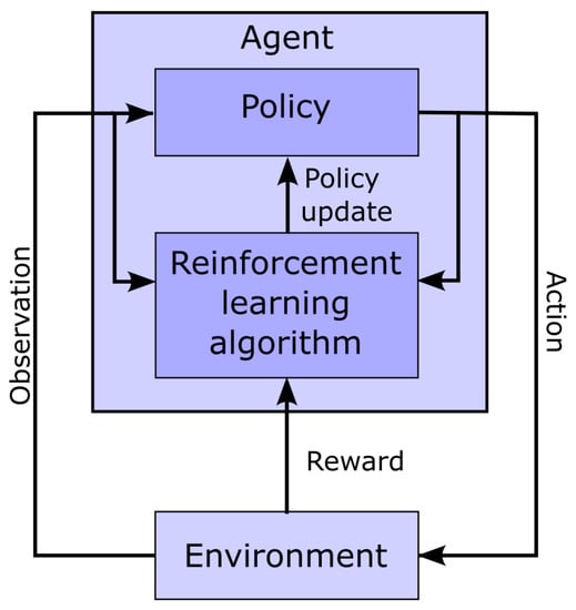 Figure 4 shows a classic schematic representation of reinforcement learning, illustrating the interplay between the learning agent and its environment. In that paradigm, the policy maps the current state of the environment to the probability of performing given actions. This policy captures the transition probability of a Markovian decision process, as it does not depend on past states. In this context, the learning task boils down to optimizing the policy so that actions leading to the highest rewards have the highest probability of being executed. To implement such an approach, the space of possible actions, the observations space (i.e., the observable environment states), and the reward must first be defined.