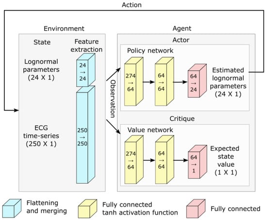 - Action space: Our model has 24 parameters. We consider these as latent variables. We defined the parameter space as a bounded box in , using the upper bound and the lower bound previously defined. Furthermore, we consider the middle of this bounded box as a reference point, i.e., . At the start of the fitting process, the estimated solution is set equal to , where the index in indicates the step number, with 0 standing for the initial estimate. The action space is a box . At each step of the fitting process, the action taken by the agent is used to update the estimated solution following the rule . However, we note that even within this relatively narrow box, the sigma–lognormal parameters can take values such that the order of the PQRST lognormal components is changed (i.e., the Q component may move after the R component). Since such an inversion is contrary to the intent of the model, we further constrain this ordering. To this end, we first define the order of lognormal components by the timing of their peak. For a lognormal defined by parameters (as defined in (2)), we can show this peak to happen at time . Thus, we constrain the impact of the action on so that it is canceled whenever it results in (i.e., the action is such that it may cause the timing of the peaks of two consecutive components to become inverted), with j and referring to two consecutive lognormal components in the set of components. Alternatively, such restrictions could have been introduced within the reward function, e.g., by adding a penalty term that reduces the reward when these constraints are violated. However, constraining the problem that way would not preclude the algorithm from reaching solutions that violate these constraints. Since these solutions are biologically irrelevant, we preferred to limit the actions to categorically prevent them. We further limit the action so that the resulting parameters remain within the box defined by and .
