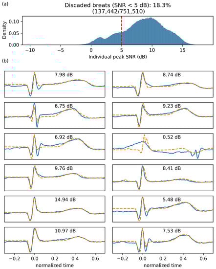 This definition is classic and widely used in the literature. It expresses in dB the ratio of the square amplitude of a signal over the square amplitude of noise (or error). The SNR characterizes how well the model fits the data. It is worth noting that an SNR of 0 means a noise amplitude as large as the signal, whereas an SNR of 20 means a noise amplitude smaller than the signal. These SNR values are computed for every beat and characterize how much these beats are similar to the average beat. By averaging these values across a segment, we obtain a value that characterizes the quality of the signal (i.e., a noisy PQRST will be less similar, resulting in lower SNR values). Since the goal of this study is not to develop preprocessing techniques to clean noisy ECG signals, we rejected all segments with an dB (N = 116). Figure 2 illustrates how the signal quality varies with . Eliminating noisy PQRST complexes allows us to concentrate on the specific contribution of this work, i.e., the model-driven analysis of the ECG. This exclusion criterion left 434 valid segments for analysis.