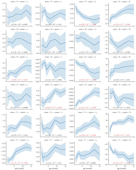 Figure 7 illustrates the relationship between every modeling parameter and the age of the infant participants. Almost half of the parameters (10/24) show a statistically significant relationship with age with a p-value lower than 0.01 after correction for multiple tests. Furthermore, from the plot, some of these relationships (e.g., for the S component or for the component) are very clear, with very low p-values and large correlation coefficients.