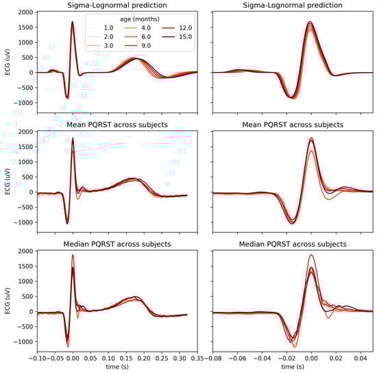 Comparison of PQRST complexes predicted from Sigma–Lognormal modeling (top panel), mean (middle panel), and median (bottom panel) PQRST across participants, for each time point with at least 8 participants. Both columns show the same data; the right columns only zoom further on the P peak to better appreciate the modulation of its amplitude by age.
