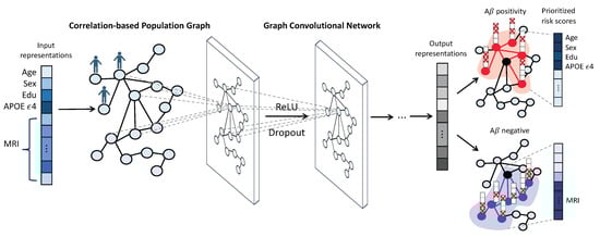 In this study, we leveraged graph convolutional networks (GCNs), which were proposed by [], with a population graph to discern the connections between the demographic and neuroimaging features of individuals. This study addresses the problem of predicting A positivity as a node (individual)-level prediction task within the GCN model. An adjacency matrix representing pairwise correlations between nodes in a population graph , a feature matrix , and labels (A positivity) are used as input to train the model.