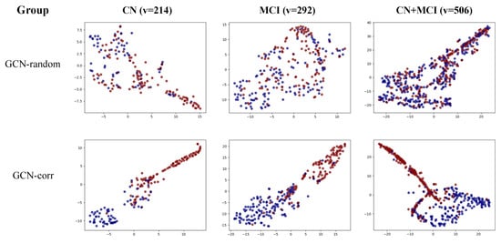 Visual representation of the final node embedding of the GCN-random and GCN-corr models across three groups: cognitively normal (CN), mild cognitive impairment (MCI), and a combined CN + MCI group. Nodes representing A-positive samples are colored blue, while those representing A-negative samples are in red. v represents the number of vertices (individuals).