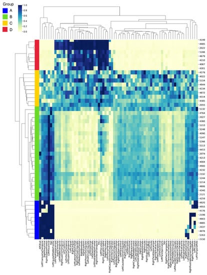 Heatmap visualization of the prioritized biomarkers derived from the GCN model with a correlation-based population graph. Each row represents an individual, and each column represents a biomarker. The color intensity indicates the importance score of each biomarker for A-positivity prediction. The individuals and biomarkers are clustered feature-wise and sample-wise, revealing four distinct groups (A, B, C, and D) based on their important biomarkers.