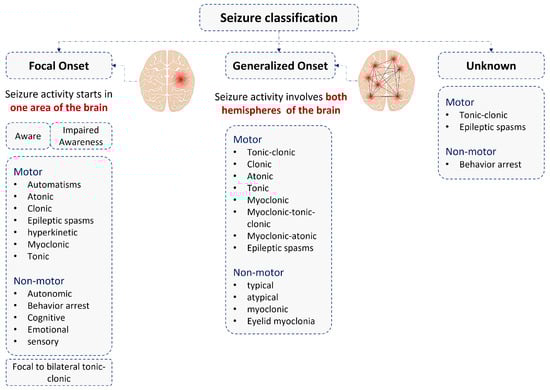 Two main groups of epileptic seizures, which are focal and generalized, are presented in Figure 1 according to the International League Against Epilepsy (ILAE) categorization strategy for epileptic seizure classifications [21]. When abnormal electrical activity begins in one area of the brain, it is called a focal or partial seizure; however, generalized seizures begin on both sides of the brain [21]. The terms “motor” and “non-motor” are also used when describing seizure types. According to the Epilepsy Foundation, motor relates to physical movement or motion, and seizures involving motor activity may either increase or decrease muscle tone, leading to muscle twitches, jerks, or contractions. Non-motor onset seizures don’t involve muscle action but may include behavioral, emotional, and/or sensory activity or actions.