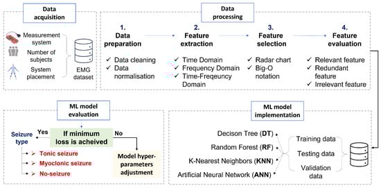 For this purpose, a surface EMG dataset is recorded as a first step using a wearable sensor node for tonic, myoclonic, and no-seizure classification. This is followed by a processing step which includes feature extraction and selection methods. Finally, the development of several machine learning algorithms will be described, followed by an evaluation. Figure 2. highlights different blocs used for epilepsy diagnosis, and each bloc will be detailed in the next sections.