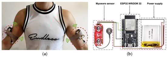 A full control system was developed with high resolution, real-time response, wireless, compact, and high sensitivity insured by WiFi communication with the ESP32 board and a local host (Figure 3a). The components of the proposed prototype are shown in Figure 3b. The system consists of a myoware sensor that converts the surface EMG signal into an easily readable format by measuring, filtering, and rectifying the recorded EMG data. Ag/AgCl electrodes with a 10 mm diameter on self-adhesive supports are used. The recorded sEMG data is transmitted to the ESP32-WROOM-32D microcontroller and then converted to a 12-bit analog-to-digital converter (ADC). A rechargeable Li-ion battery with a capacity of 2400 mAh, 3.7 V, and 8.9 Wh is used as a power supply for all components. The wireless node can continuously transmit raw data for up to 12 h. All components can perfectly fit into the textile hand band with a system length, width, and height equal to 50.5 mm, 38.6 mm, and 33.6 mm, respectively.