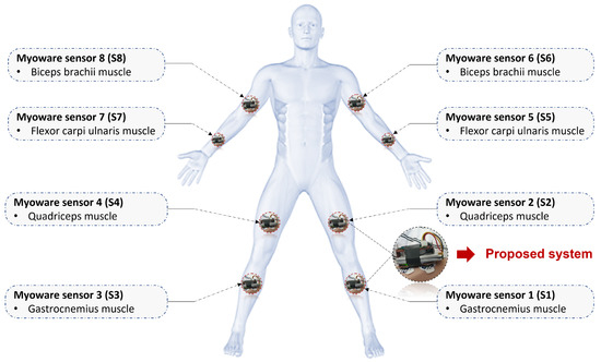 The placement of the proposed wireless sensor node is presented in Figure 4. sEMG electrodes are placed at the recommendation of the Department of child neurology at Hospital Hedi Chaker of Sfax in Tunisia. For that, Ag/Agcl electrodes are placed at a specific position regarding the epileptic seizure movement chosen to be detected. The gastrocnemius flexor carpi ulnaris, biceps brachii, and quadriceps muscles are the selected position for No-seizure, Myoclonic, and Tonic seizure movements distinguish and classification.